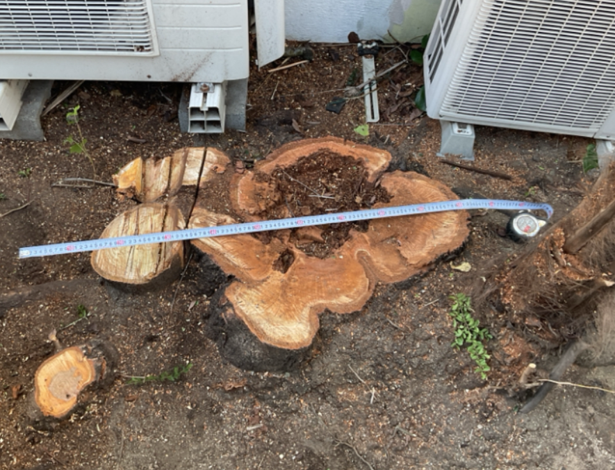 芦屋市 A様宅 桜 9mの伐採。室外機が近い。残す木が近い。株立ち複合型で 約90cm程直径がありました!物損のリスク、大切な木のそば、交通量が多く緊張感がMaxの案件でした。ロープで釣りながら 歩行者や車に気を付け、誘導を行い安全に作業は約5時間で無事完了。切り株は邪魔にならないように 地際切りは欠かせません!